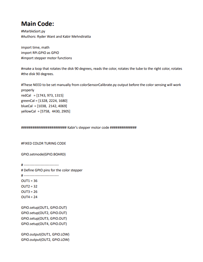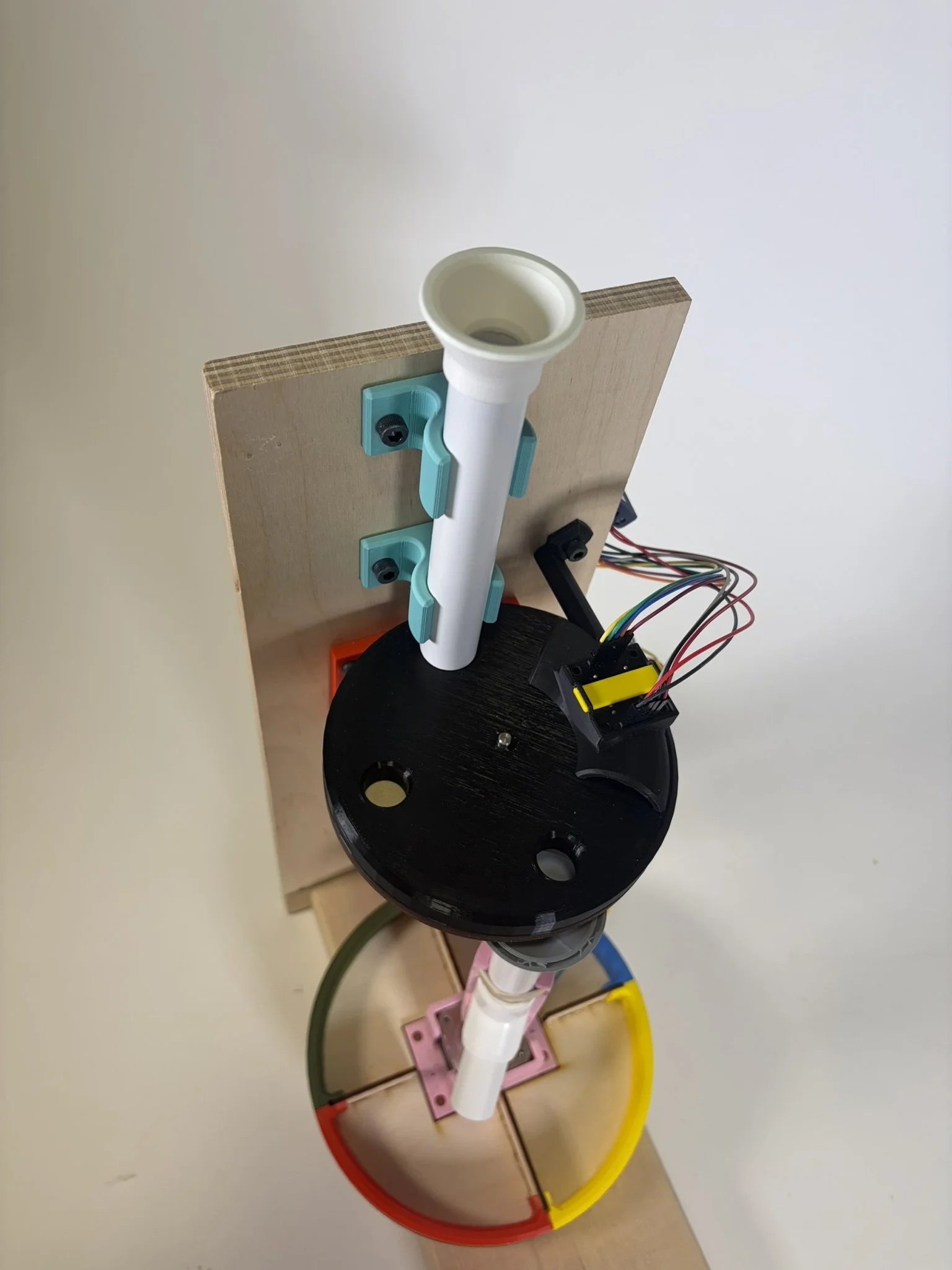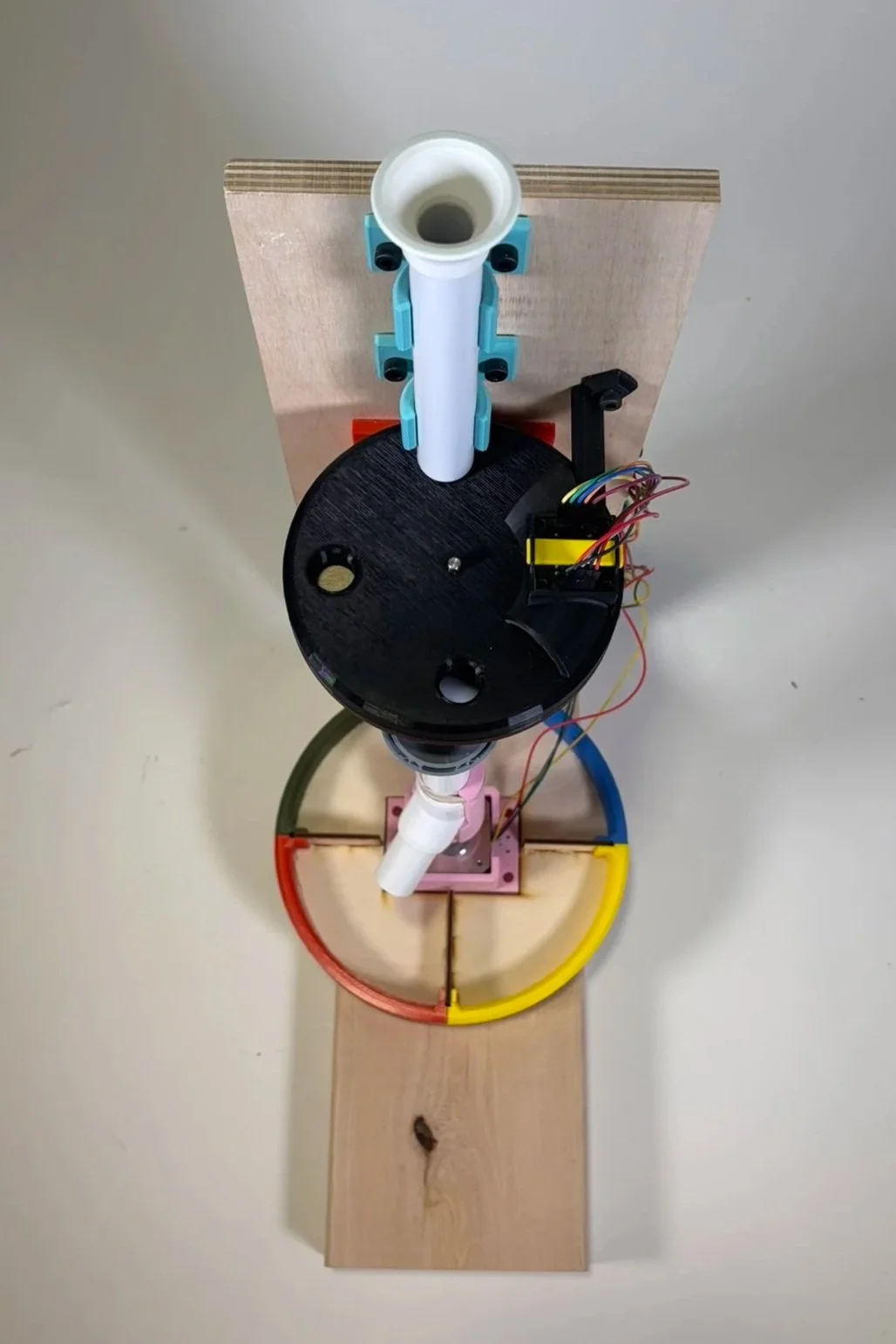 After the ball’s color is classified, the second stepper motor rotates the output chute either clockwise or counterclockwise, choosing the direction that requires the fewest steps